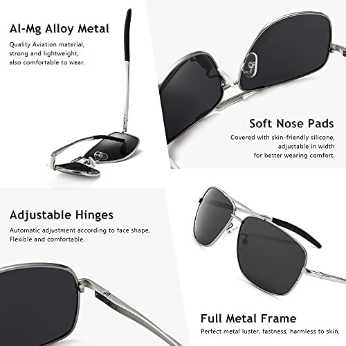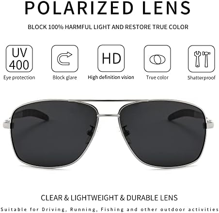 Klassischer All-Match-Stil – perfekt kombiniert mit Piloten- und quadratischen Sonnenbrillen, klassisch und nie aus der Mode, passend für die meisten Männergesichter. Quadratisches Pilotendesign, ideal zum Fahren, Laufen, Angeln, Skifahren, Klettern, Trekking, Radfahren und andere Outdoor-Aktivitäten.TAC Polarized Lens – UV400-Schutzbeschichtung blockiert 100 % der schädlichen UVA- und UVB-Strahlen. Stellt visuell die wahre Farbe wieder her, eliminiert reflektiertes oder gestreutes Licht. TAC polarisierte Gläser sind stoß- und kratzfest, leicht und langlebig.Bequem – Federscharniere, superweiche Silikon-Nasenpads, flexible Bügel und weiche Bügelabdeckungen aus Gummi bieten Ihnen ein brandneues komfortables Erlebnis.Vollmetallrahmen – Das starke Metallmaterial macht die Sonnenbrille haltbarer für längeren und hochfrequenten Gebrauch. Die klassische dezente Glasfarbe unterstreicht die Qualität.Attraktive Wahl – Das hohle Design des doppelten Nasenstegs erhöht das dreidimensionale Gefühl, die einfache Gesamtform mit glatten Rahmenlinien trifft die Persönlichkeit des Mannes und verbessert den Charme-Index.
